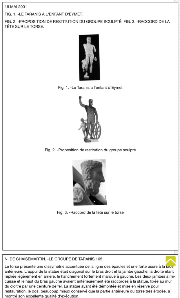CHAISEMARTIN Nathalie de, Le groupe de Taranis à l’enfant d’Eymet, In: Bulletin de la Société Nationale des Antiquaires de France, 2001, 2006. pp. 162-173.