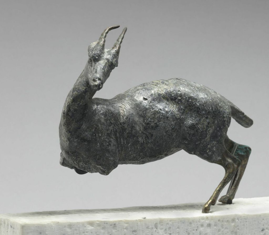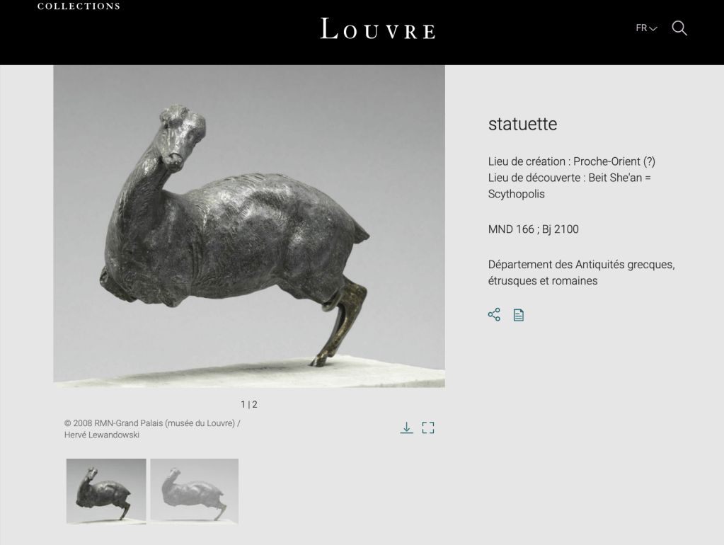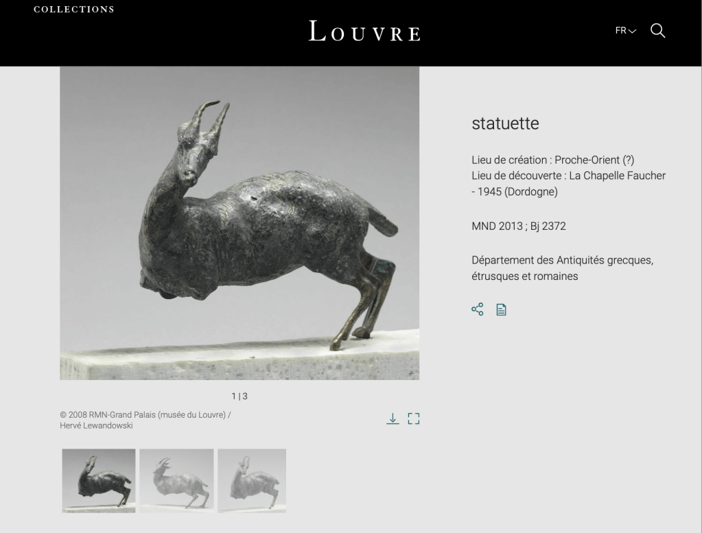 Les deux biches ont été exposées dans les vitrines du Louvre. La notice du Louvre indique qu’elles sont actuellement en réserve.